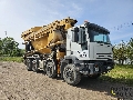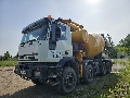 Truck with concrete transport capacity and concrete pump is in working condition.