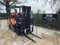 Doosan G20GP With 2566 Hours. Lifts 2 Tonne, Max Height 4.7m, Mitsubishi Engine, LPG, Triple Free Lift Mast, Container Spec, Side Shift, Working Lights. Supplied With Pallet Forks.